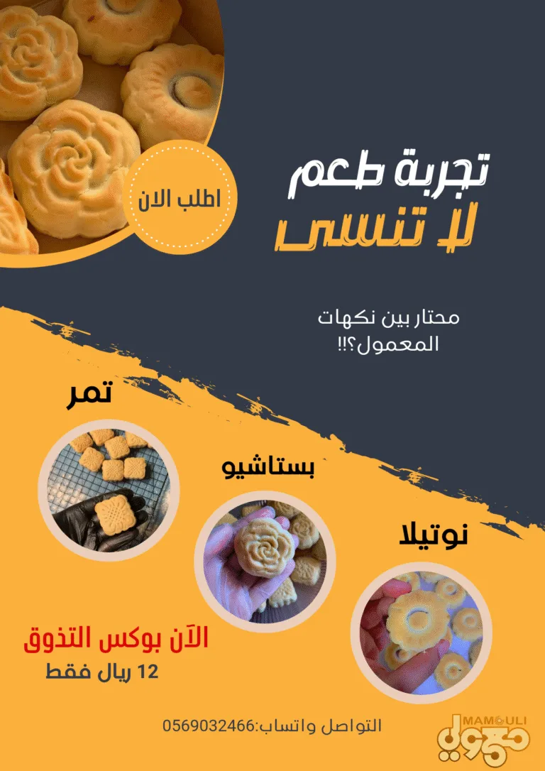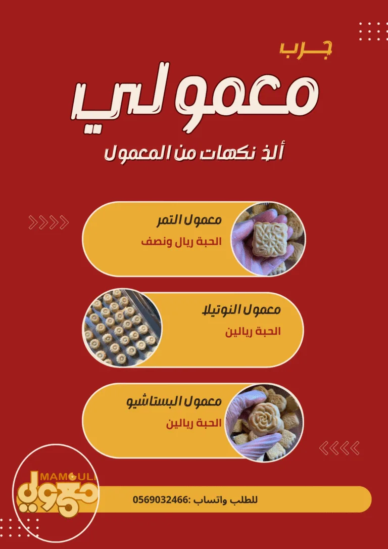 “معمولي” يقدم لكم ألذ وأجود أنواع المعمول الترف والخفيف بنكهات فريدة تجمع بين الأصالة والابتكار — تمر، نوتيلا، وبستاشيو. مصنوع بعناية من أسرة منتجة تهتم بالجودة والطعم الأصيل لتمنحكم تجربة حلا لا تُنسى.